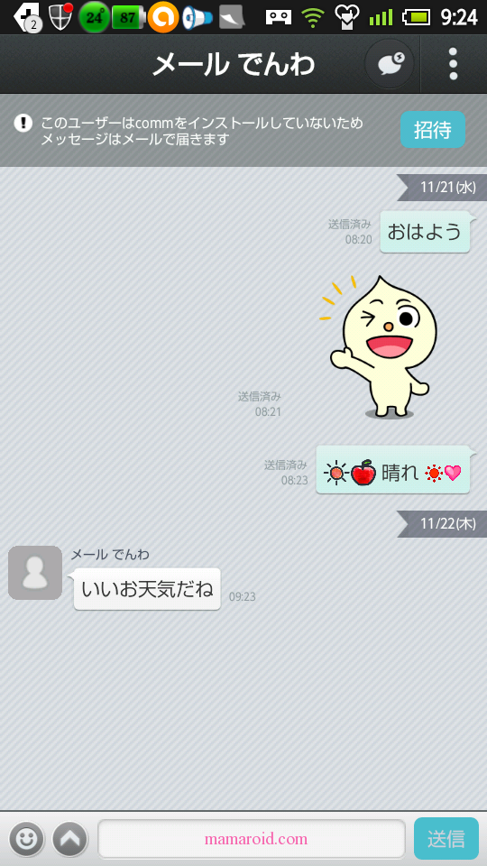 たとえば、まだ「comm」を始めていない「メールでんわ」さんへトークルームからメッセージをおくってみます。